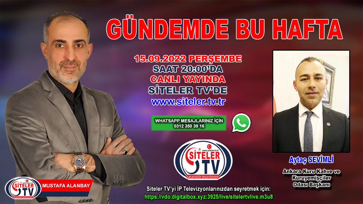 Mustafa ALANBAY ile GÜNDEM DE BU HAFTA Programı 15.09.2022 Perşembe günü akşam saat 20.00’da Siteler TV Ekranlarında CANLI yayın da seyredebilirsiniz.